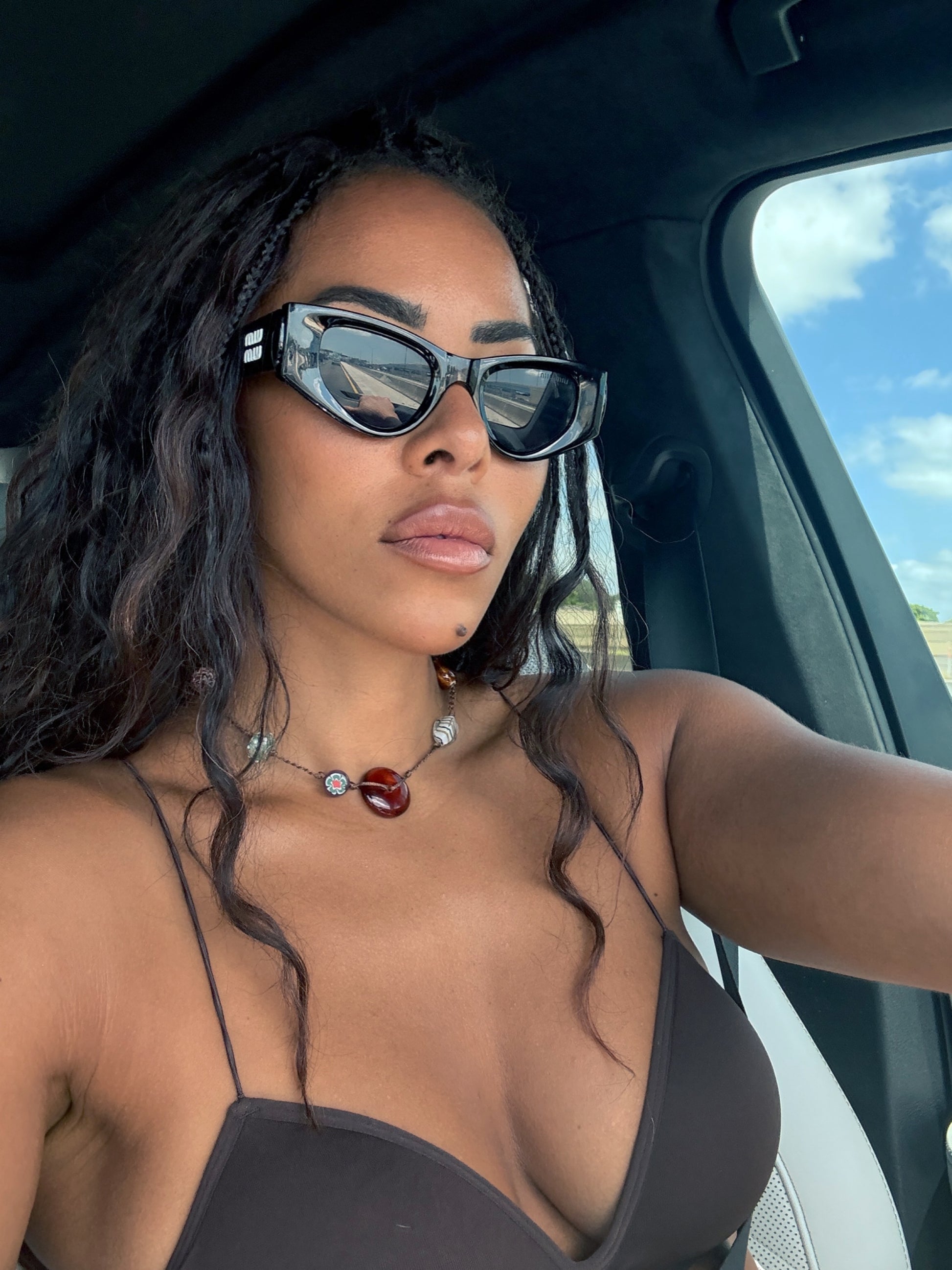 Modern cat eye frames with logo on temples, available in black, brown and beige.